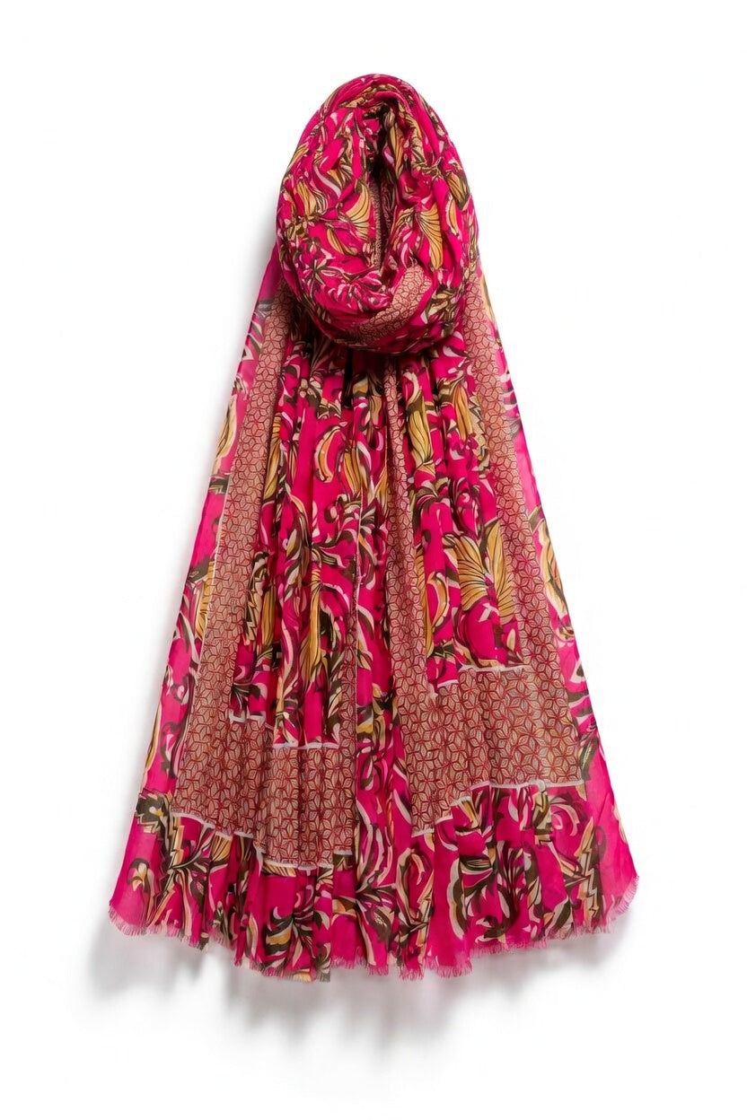 Pink Indian Inspired Leaf Print Frayed Scarf