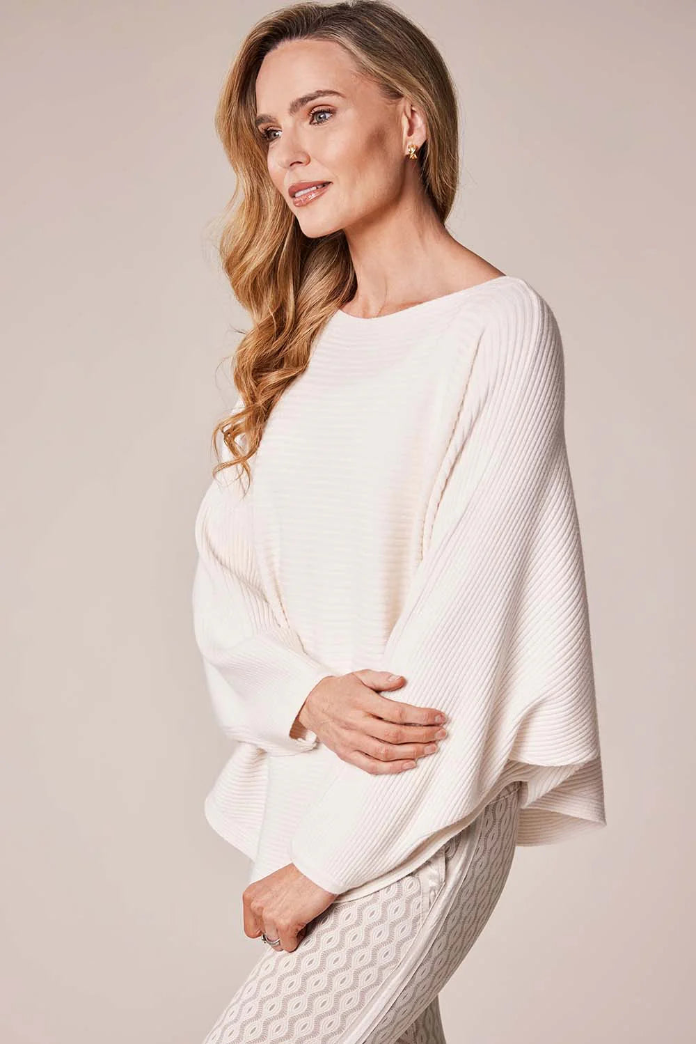 Stand out this season for the right reasons with this sophisticated, beige ribbed batwing knit by Decollage. Made from a carefully balanced blend of viscose, polyester, and nylon, it feels wonderfully soft against the skin and maintains its shape through countless wears.