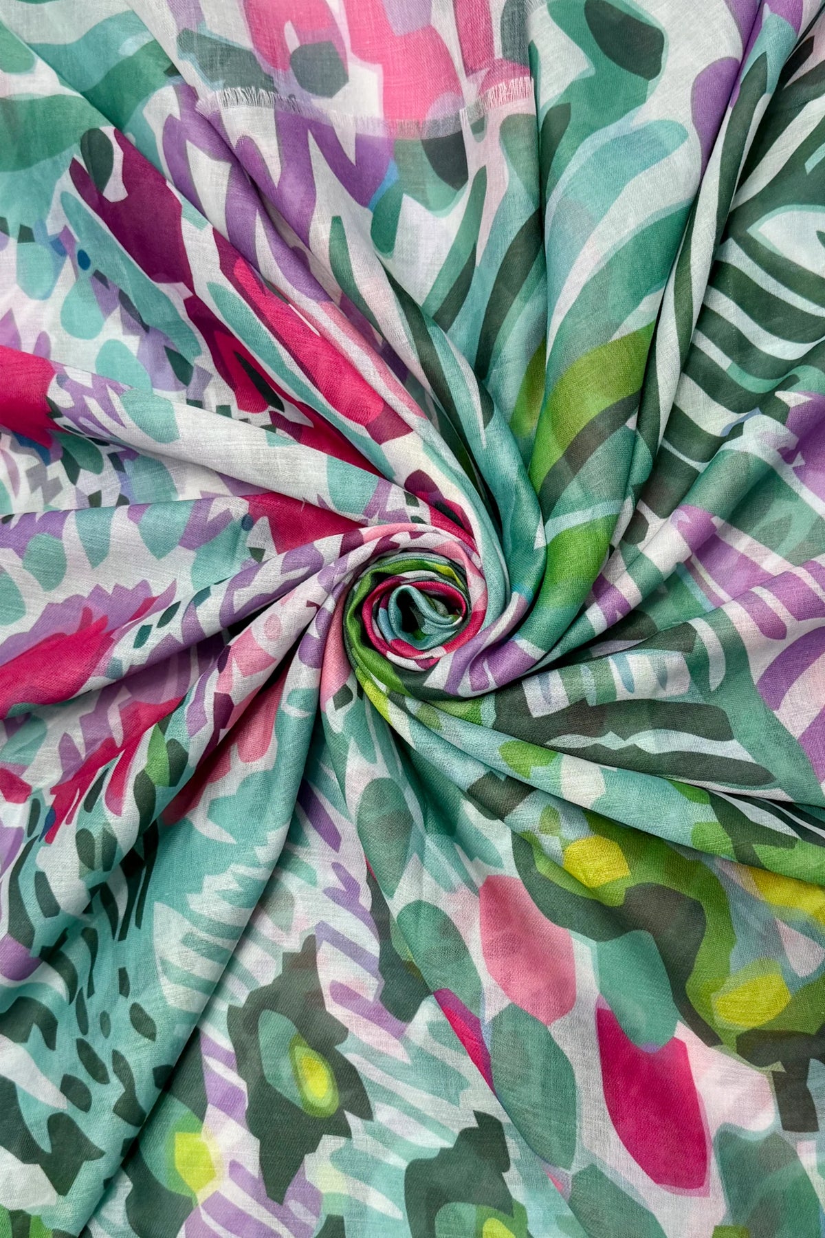 Green/Fuchsia Tropical Floral Illustrated Frayed Scarf