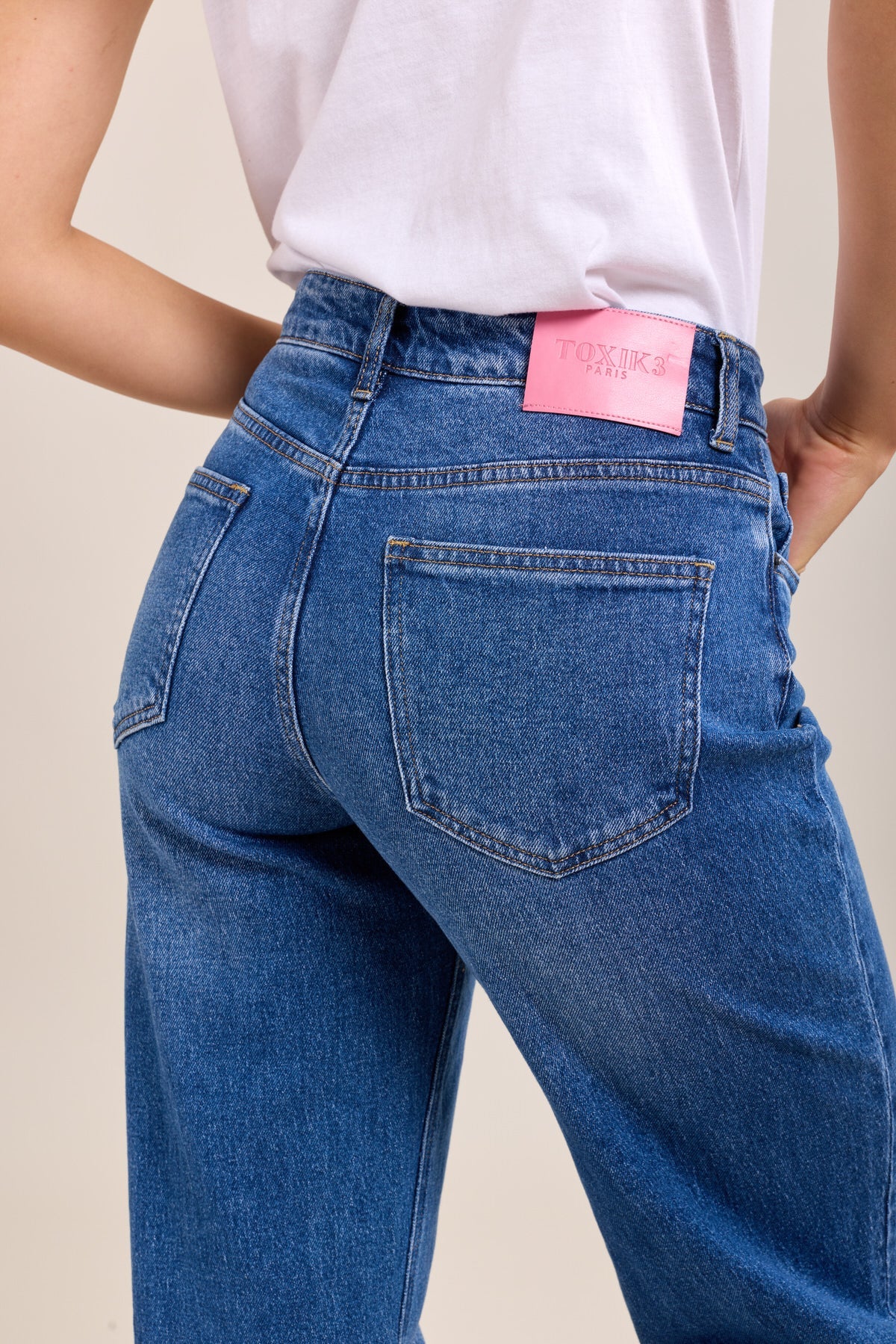 These high-waisted straight Toxik Jeans are cut from soft, slightly stretch denim for all-day comfort without sacrificing shape. The turn-up hems, finished with contrasting pink stitching and a matching jacron patch, add a sharp, playful detail that makes them stand out.