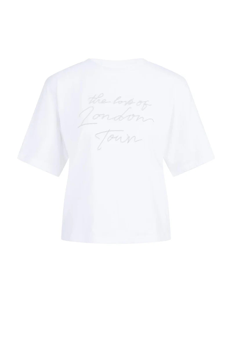 This cotton T-shirt has a loose, slightly boxy fit and features short, wide sleeves. On the chest is a flockprint with the text 'The love of London Town in a soft finish. The round neck and clean finish make it a casual item with a stylish twist. The model is 178 cm and wears size S.